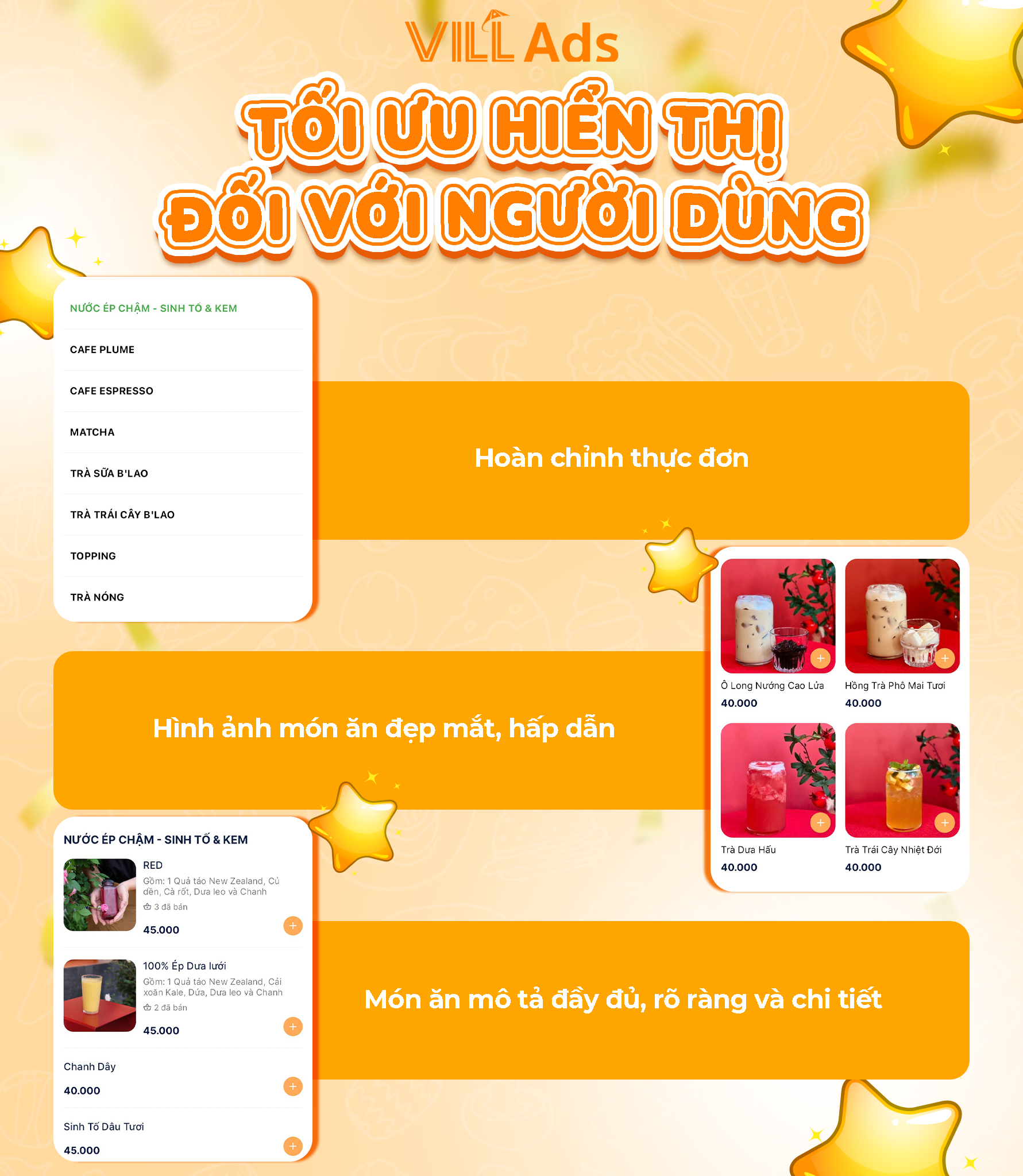 Là Đối tác Bán hàng của VILL, bạn có thể áp dụng một số cách sau để tối ưu hiển thị cửa hàng của mình trên ứng dụng bằng cách: Hoàn chỉnh thực đơn, hình ảnh món ăn, mô tả đầy đủ, rõ ràng và chi tiết nhằm thu hút sự chú ý của người dùng và gia tăng cơ hội nhận đơn hàng.