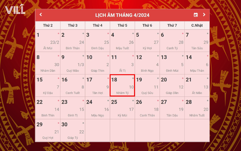 Trong năm 2024, giỗ Tổ Hùng Vương (ngày 10 tháng 3 âm lịch) sẽ rơi vào thứ Năm (tức là ngày 18 tháng 4 dương lịch).