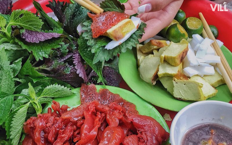 Món ăn này sẽ được người dân Hà Thành ăn cùng với đậu hũ nghệ nướng, cùi dừa thái mỏng, lá kinh giới, tía tô và chấm kèm mắm tôm.