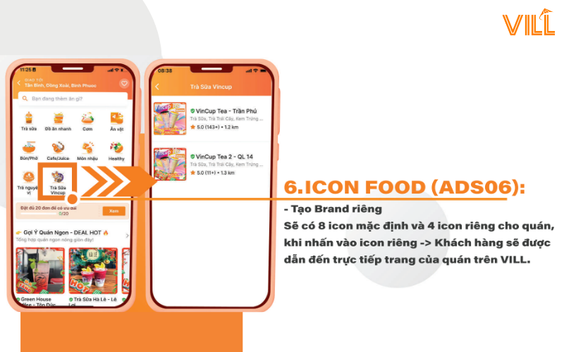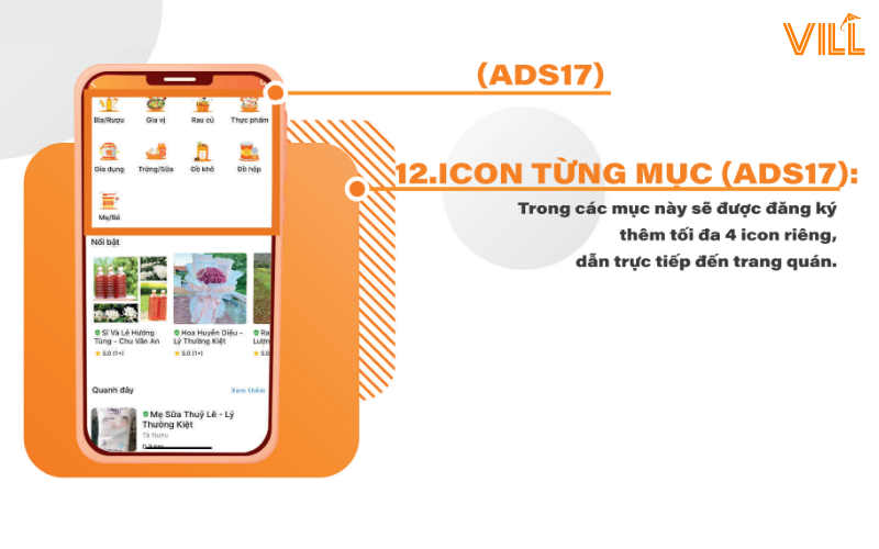 Trong các mục này sẽ được đăng ký thêm tối đa 4 icon riêng, dẫn trực tiếp đến link quán tại app VILL.
